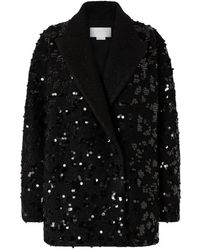 Ga naar MiintoGenny Caban Coat van bouclé breisel, gedetailleerd met micro pailletten en geweven platen voor een verfijnd statement. Ontworpen als een oversized buitenlaag, combineert het details van maatwerk met decoratieve afwerkingen voor een verhoogde