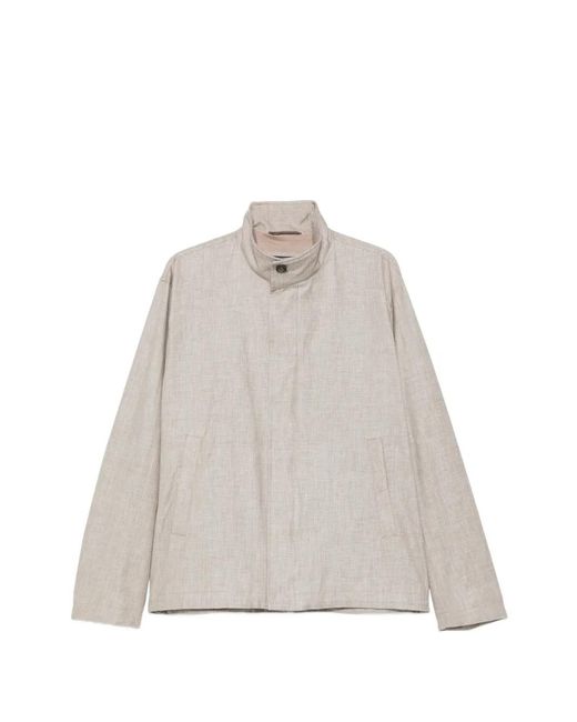 Beige knoop- en ritssluiting zijzakken hoge hals Size: 48. Gender: Male. Material:linnen/vlas/wol/zijde/polyurethaan/polyamide. Kleur: naturel