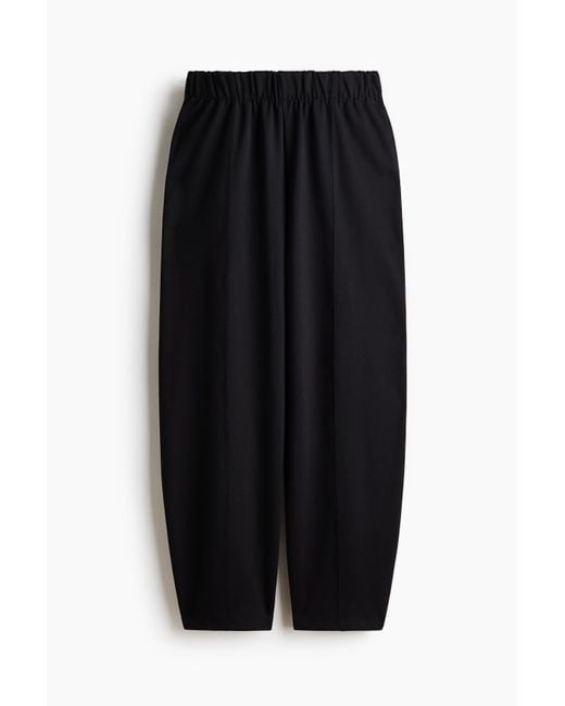 Een broek van Punta di Roma-tricot met een ruime pasvorm, elastiek in de taille en pijpen in een 'barrel'-model met zichtbare naden voor en achter. Kleur: zwart