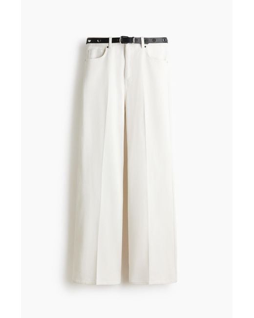 Een nauwsluitende broek van licht elastisch katoenen twill met een hoge taille met een gecoate ceintuur met studs en een gulp met ritssluiting en knoop. Het model heeft zakken voor en achter en bootcut-pijpen met een persvouw voor en achter. Kleur: wit