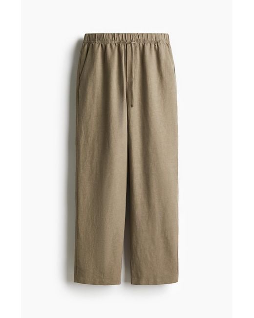 Een enkellange broek van luchtige, geweven linnenmix met een hoge taille en een ruime pasvorm. Het model heeft bekleed elastiek en een smalle drawstring in de taille, schuin ingezette steekzakken en smal toelopende pijpen. Kleur: naturel