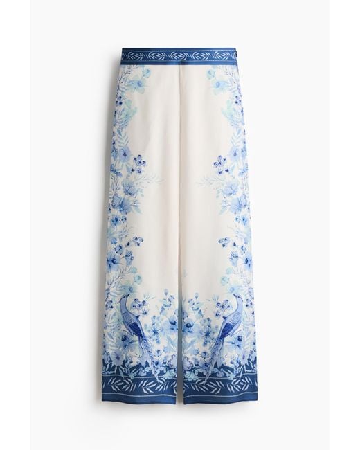 Een broek van lyocelltwill met een print. Het model heeft een hoge taille, een blinde ritssluiting aan de zijkant en rechte pijpen met een bies overlangs aan de zijkant. Kleur: blauw