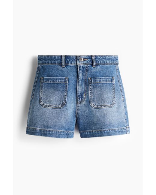Een short van licht elastisch katoenen denim met een hoge taille en een gulp met ritssluiting en knoop. Het model heeft opgestikte zakken voor en achter. Kleur: blauw