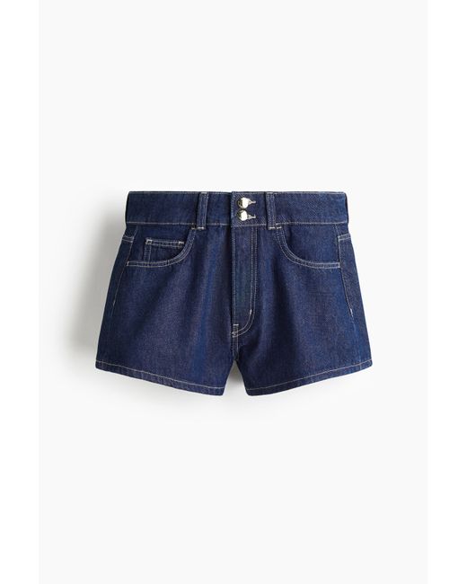 Een 5-pocketshort van stevig katoenen denim met een ruime pasvorm, een hoge taille en een gulp met ritssluiting en twee knopen. Het model heeft licht naar voren gedraaide zijnaden. Kleur: blauw