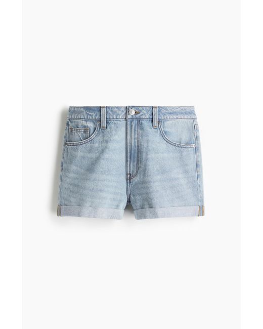 Een 5-pocketshort van stevig katoenen denim met een hoge taille en een gulp met ritssluiting en knoop. Het model heeft een vastgestikte omslag onder aan de pijpen. Kleur: blauw