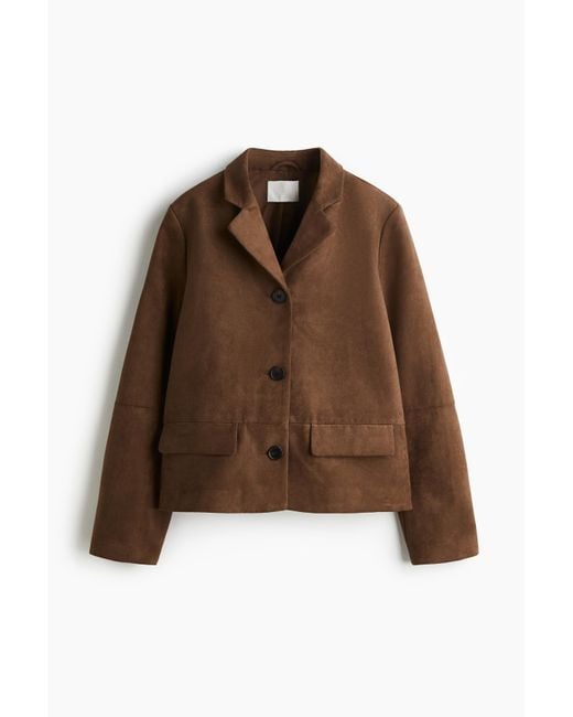 Een jack van geweven kwaliteit met een zachte, geweven afwerking. Het model heeft revers en een knoopsluiting en zakken met een klep voor. Gevoerd. Kleur: bruin