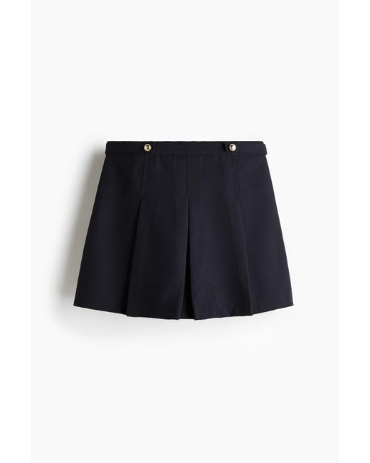 Een korte skort van geweven kwaliteit met stolpplooien voor. Het model heeft een hoge taille met een bandje met knoop voor en een blinde ritssluiting aan de zijkant. Kleur: blauw