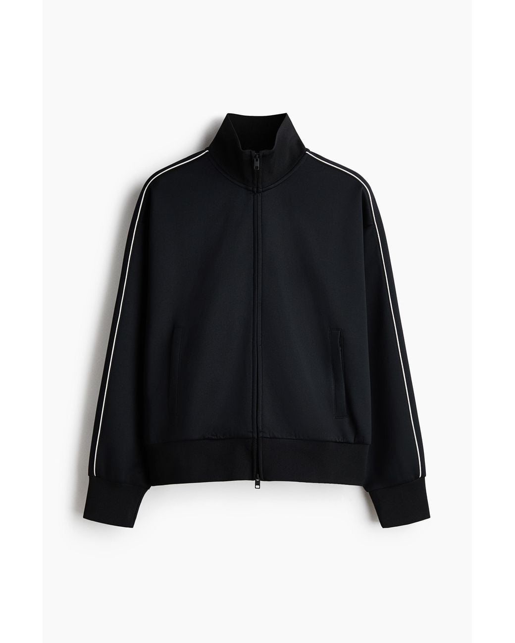 Een trackjacket van scuba met een opstaande kraag en een blinde tweewegritssluiting voor. Het model heeft verlaagde schoudernaden, paspelsteekzakken en een brede, geribde boord aan de onderkant en onder aan de mouwen. Afgewerkt met biesjes in een contrasterende kleur overlangs op de mouwen. Loose Fit voor een ruim maar niet oversized silhouet. Kleur: zwart