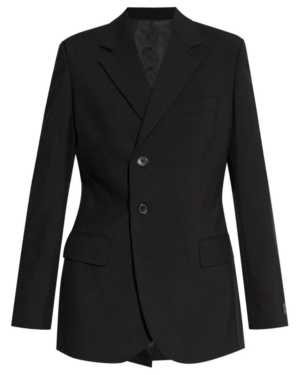 Zwart scheerwol gekartelde revers knoopsluiting twee klepzakken aan de zijkant logopatch op de mouw lange mouwen rechte zoom Size: 34. Gender: Female. Material:scheerwol. Kleur: zwart