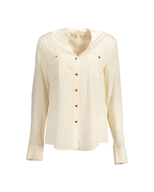 Kocca damesoverhemd met lange mouwen, opstaande kraag, manchetten met 2 knopen, 2 voorzakken, knoopsluiting, logo. Kleur: naturel