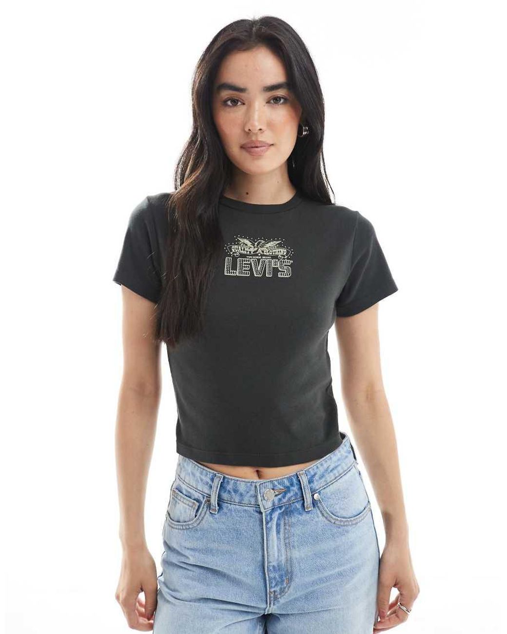 Tops van Levi's Met ronde hals Korte mouwen Versierd Levi's-logo op de borst Cropped lengte Slim-fit Kleur: zwart