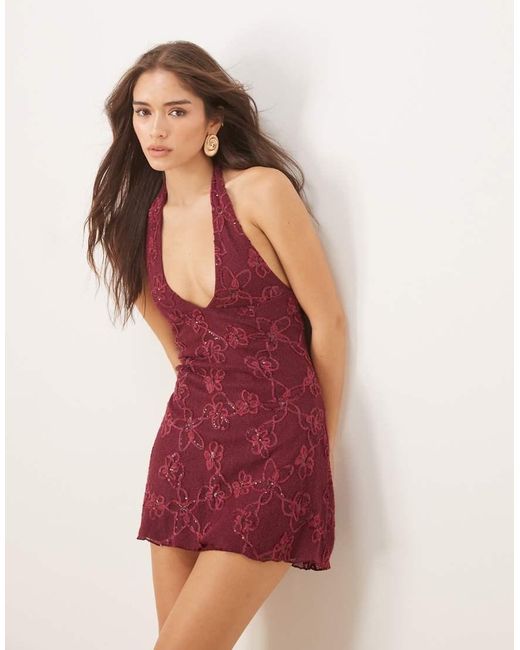 Jurken van Motel Bloemenpatroon Halternek Open achterkant Strikbandjes Slim-fit Kleur: rood
