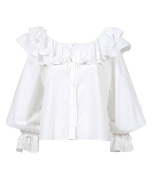 Katoen - brede ronde halslijn Volledig gericht met twee zachte ruches - Blootgestelde voorste knopsluiting - Gepofte lange mouwen met dubbele ruchemanchetten - rechte zoom - Regelmatige pasvorm. Kleur: wit