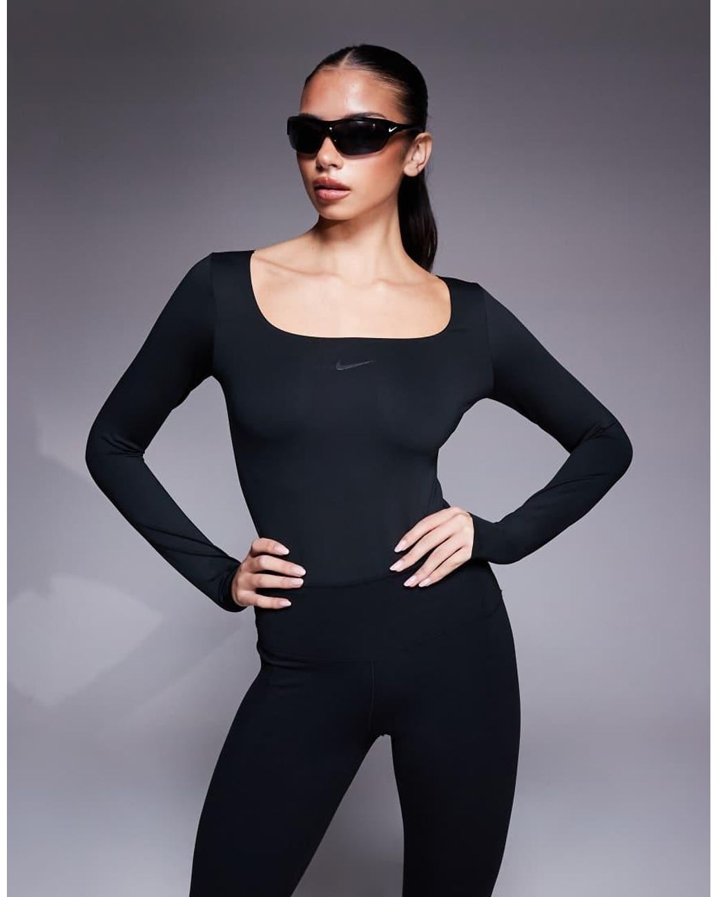 Top van Nike Training Vierkante hals Lange mouwen Met Nike logo Bodycon pasvorm Kleur: blauw