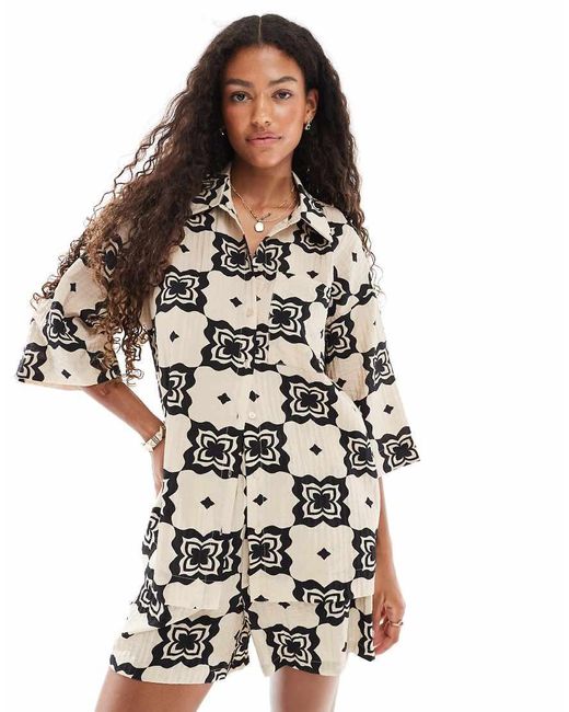 Tops van Object All-over print Brede kraag Knoopbies Driekwart mouwen Oversized pasvorm Kleur: wit