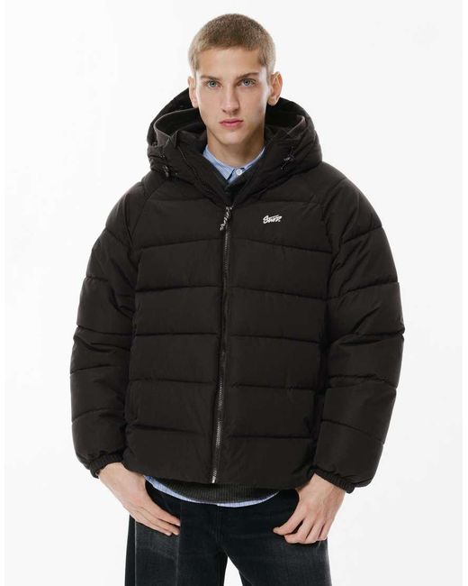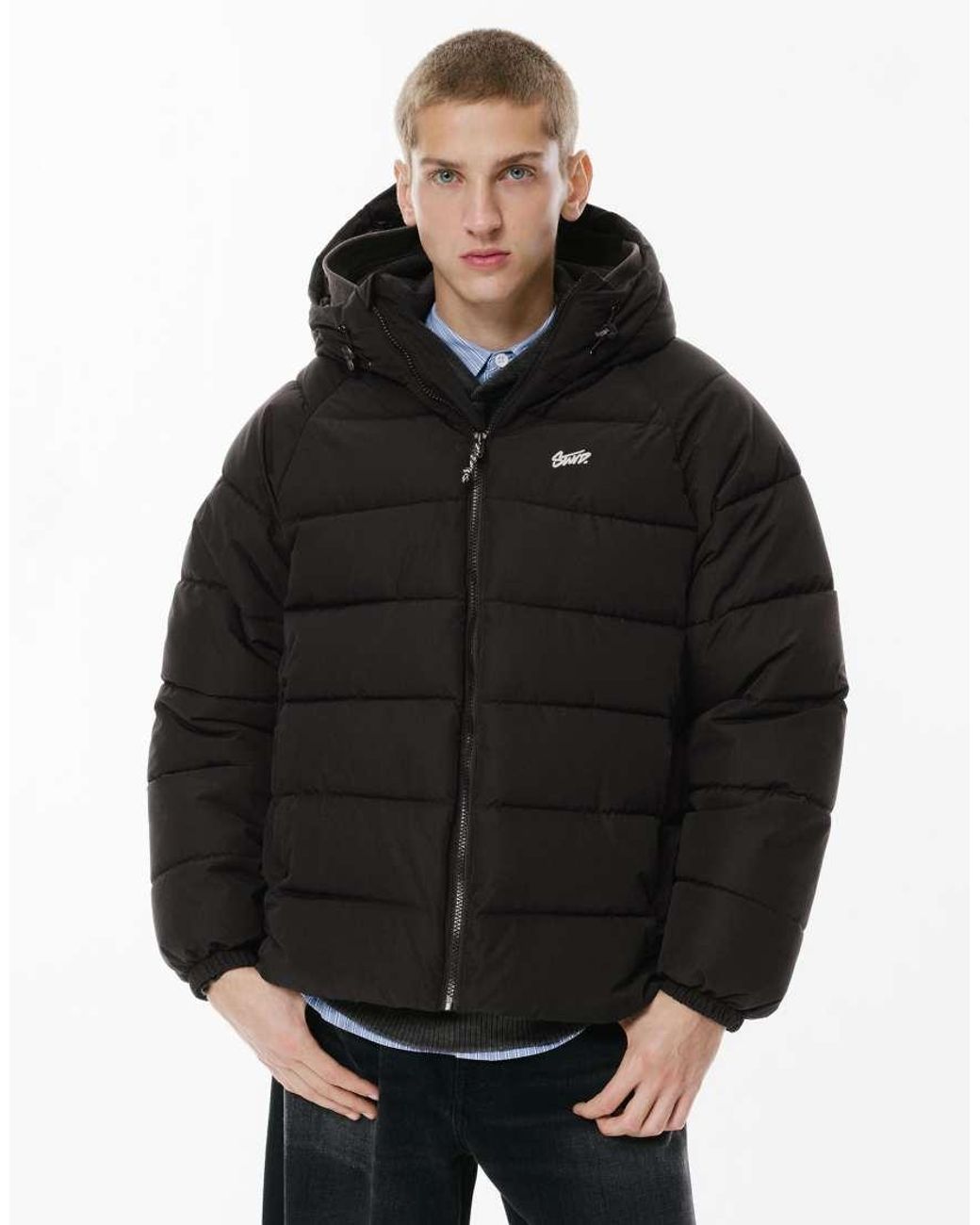 Jassen & Jacks van Pull&Bear Voorgevormd model Met capuchon Ritssluiting Geborduurd logo op de borst Steekzakken Regular fit Kleur: zwart