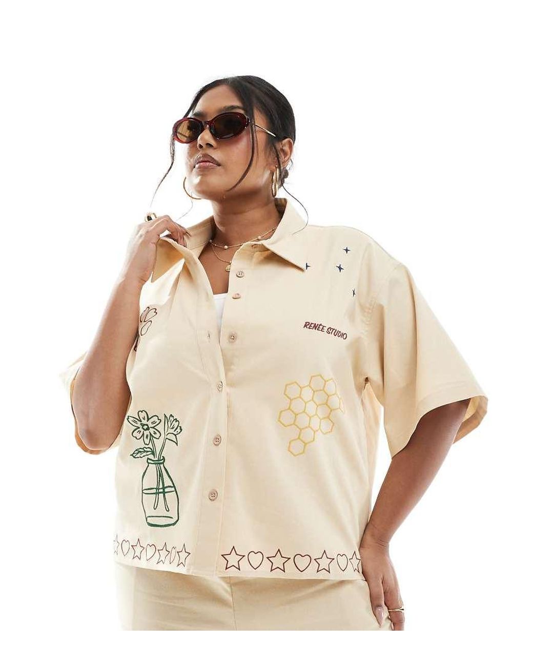 Tops van Renee Studio Brede kraag Knoopbies Korte mouwen Met borduursel Regular fit Kleur: naturel