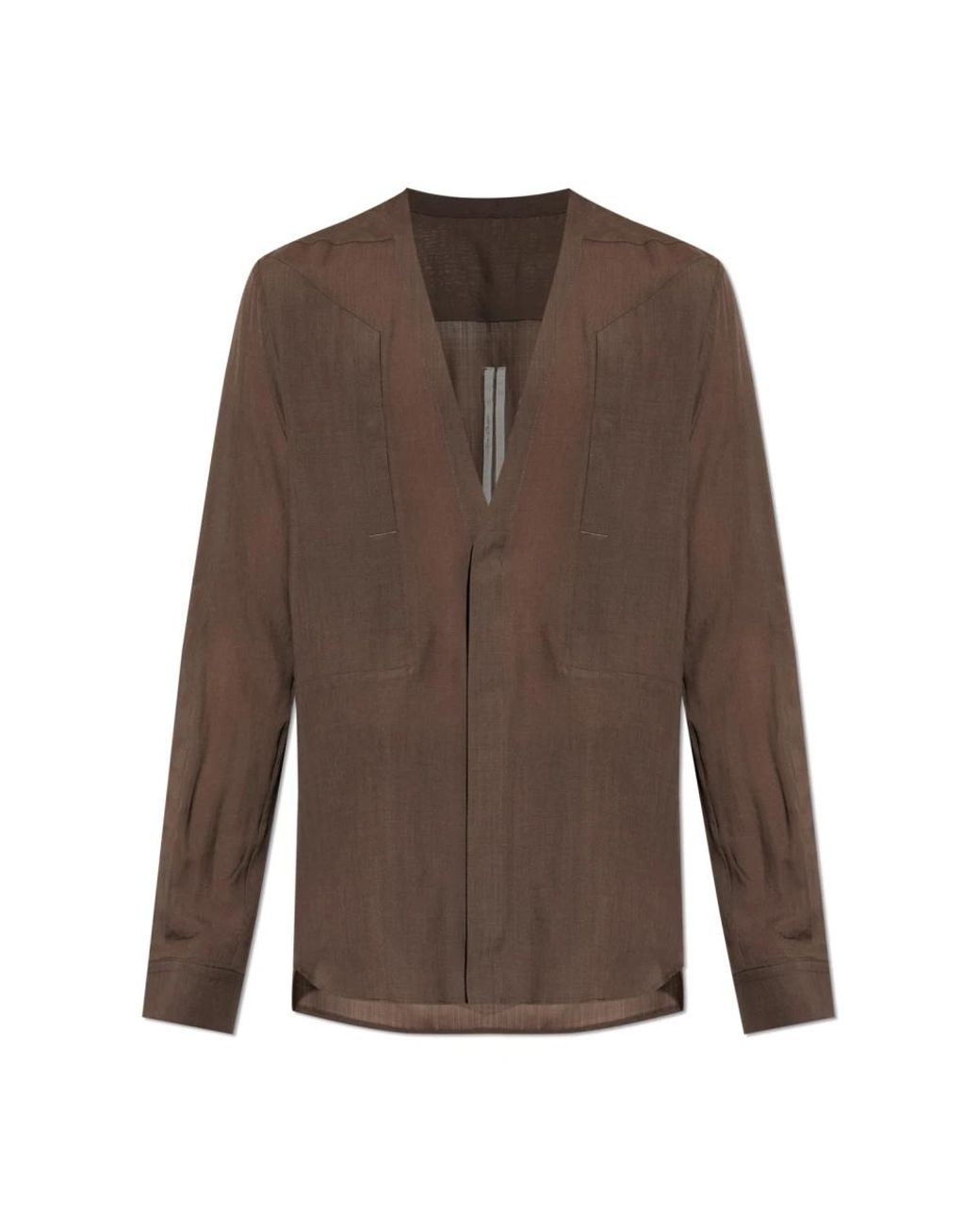 Het Rick Owens wollen V-hals shirt combineert een minimalistisch, kraagloos silhouet met een diepe V-hals en lichtgewicht wol voor een ademende, verfijnde look. De semi-transparante textuur en discrete afwerking maken het geschikt om in laagjes te dragen of als los item. Belangrijkste kenmerken: Bruin | Wol | Ademende stof | Lichtgewicht | Diepe V-hals | Geen kraag | Semi-transparante textuur | Lange mouwen met gedefinieerde manchetten | Discrete stiksels en sneden aan de voorkant | Afmetingen en pasvorm: Lengte model: 185 cm | Borst: 92 cm | Taille: 74 cm | Heupen: 91 cm | Model draagt maat: 48 | Licht losse pasvorm Kleur: bruin