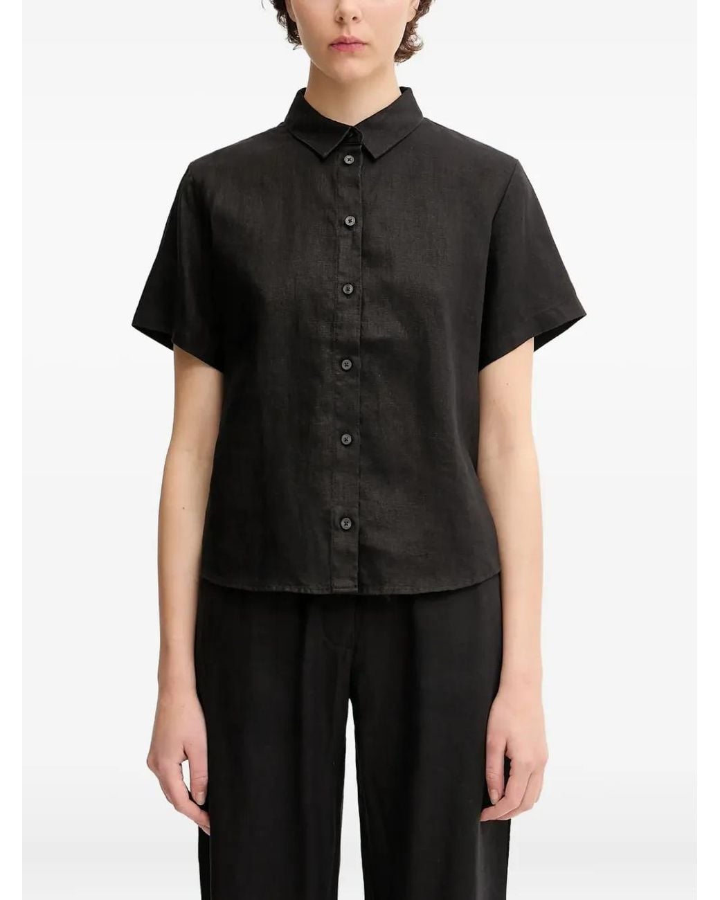 Zwart linnen knoopsluiting kraag bij de hals korte mouwen Size: S. Gender: Female. Material:linnen/vlas. Kleur: zwart