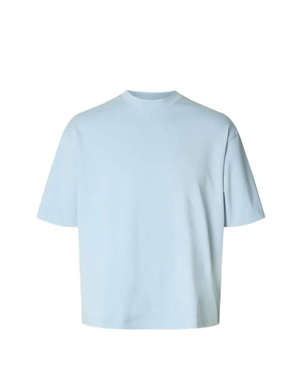 Blauw katoen ruimvallend korte mouwen ronde hals Size: S. Gender: Male. Material:biologisch katoen/katoen. Kleur: blauw