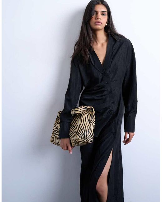 Jurken van Topshop Deze overhemdjurk is gemaakt van een geweven stof met textuur. Hij heeft een wide spread boord, een asymmetrische knoopbies, lange mouwen en een split aan de zijkant. Kleur: blauw