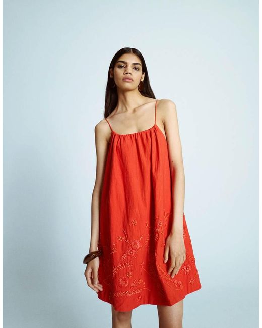 Mini-Swingjurk Met A-Lijn En Raffia Borduursels in het rood voor dames
