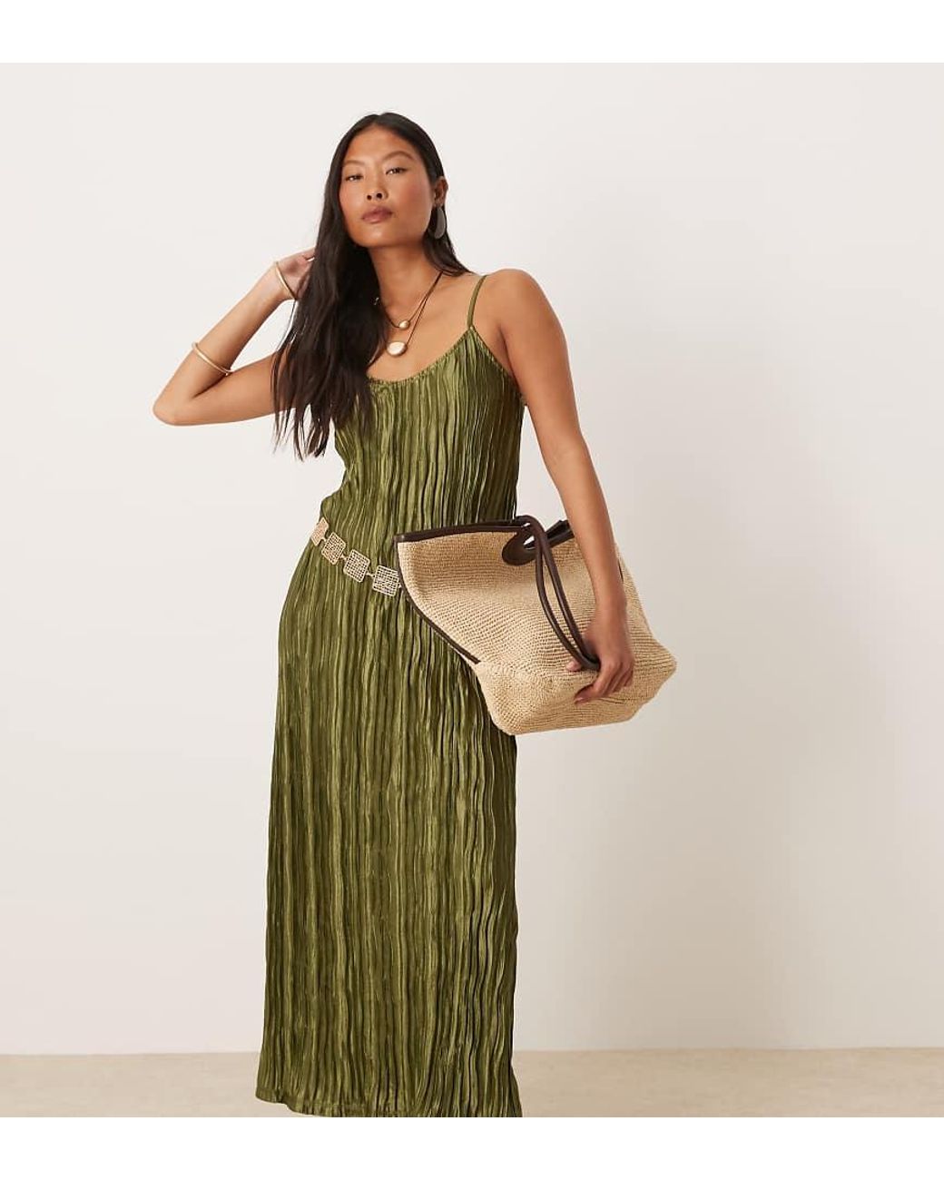 Jurk van Vila Petite Onderjurk-stijl Lage ronde hals Smalle bandjes Lage ronde hals op de rug Ruimvallende snit Riem niet inbegrepen Kleur: groen
