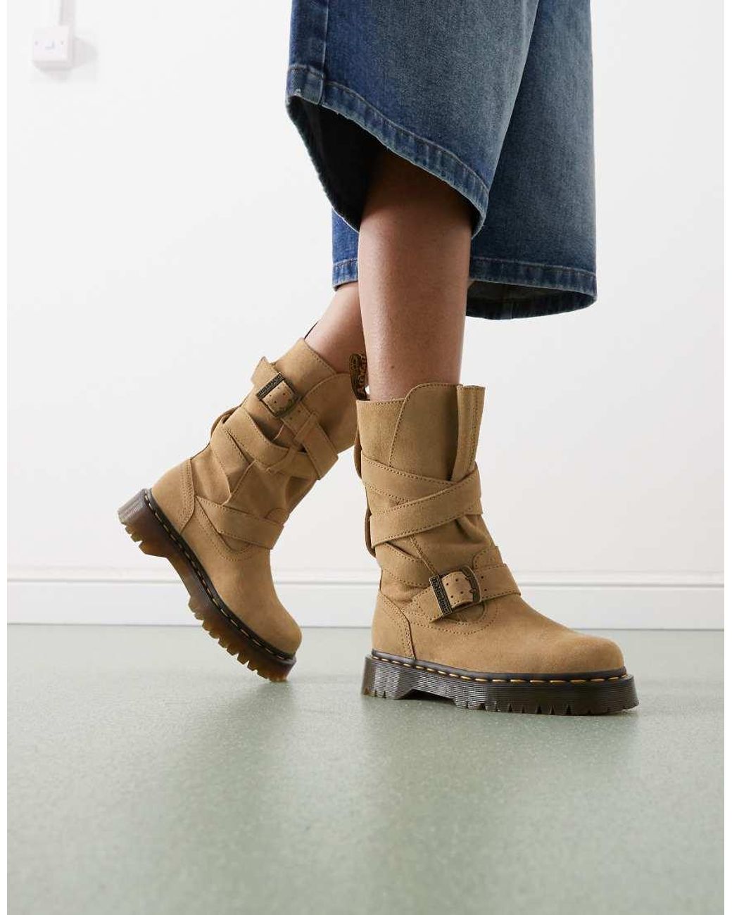 Schoenen van Dr Martens AirWair-lusje om gemakkelijk aan en uit te trekken Gespsluiting Met sierbandjes Verstelbare bandjes Kenmerkend Dr Martens-logo Ronde neus Dikke zool Zool met profiel Kleur: bruin