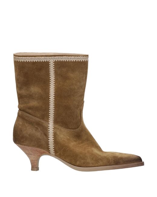 Suède leer - Buisvormig ontwerp met medium en brede pijpen - Zichtbaar borduurwerk op de naden en bovenrand - Instapper - Puntige neus - Leren voering - Leren zool - Gestratificeerde lage hak - Hakhoogte 5 cm. Kleur: bruin