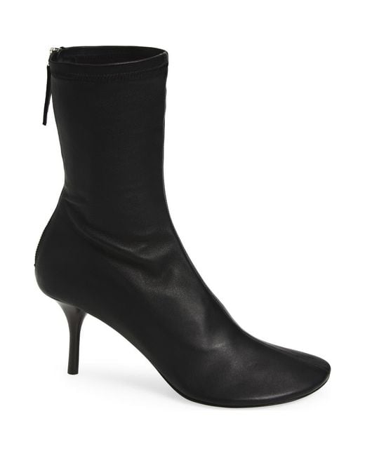 A branded tab extends from the stacked stiletto heel of a fitted bootie shaped from sleek lambskin leather. Color: gray
