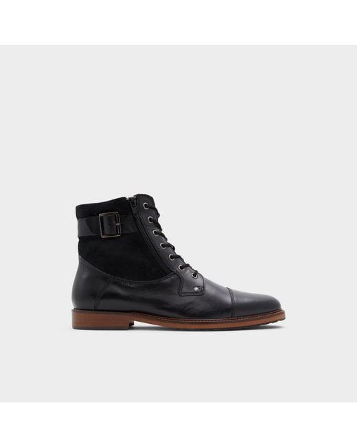 Contrasting smooth leather and suede define this black lace-up boot, highlighting a cap toe with buckle strap and a side zipper for easy on and off, while a lugged rubber sole keeps sure footing on any surface. Pair it with cuffed denim for nights out, or elevate wool trousers at the office for a polished boardroom moment. Gender: MALE; Color: Black; Category: Men > Footwear > Boots > Lace-up boots
