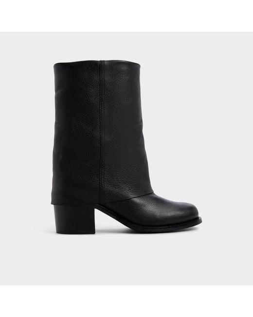 Supple black leather wraps a streamlined mid-calf shaft, and the quietly bold block heel gives solid, all-day lift so coffee-run strides, corridor turns, and after-hour detours feel effortless and surefooted. Pair with tailored pants for presentation mornings, or slip alongside a sweater dress when park walks shift into candlelit tapas. - ALDO. Color: Black. 7.