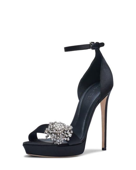 This platform sandal is quietly seductive with its satin construction and sky-high stiletto while bringing an element of signature gothic glamour with a skull charm on the right ankle strap and a removable crystal brooch at the left toe. Color: blue