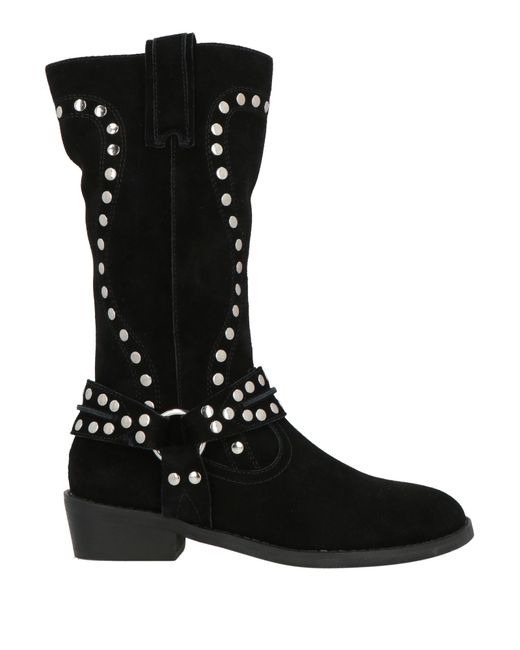 Boots, suede, solid color with appliqués, studs, leather lining, round toe, low heel, rubber cleated sole, contains non-textile parts of animal origin , Color: Black , Size: 8
