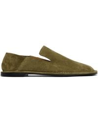 Go to SSENSECrinkled grained leather loafers in black and off-white. · Square moc toe · Pull-loop at heel collar · Buffed leather and suede lining · Topstitching at welt · Stacked leather heel with rubber