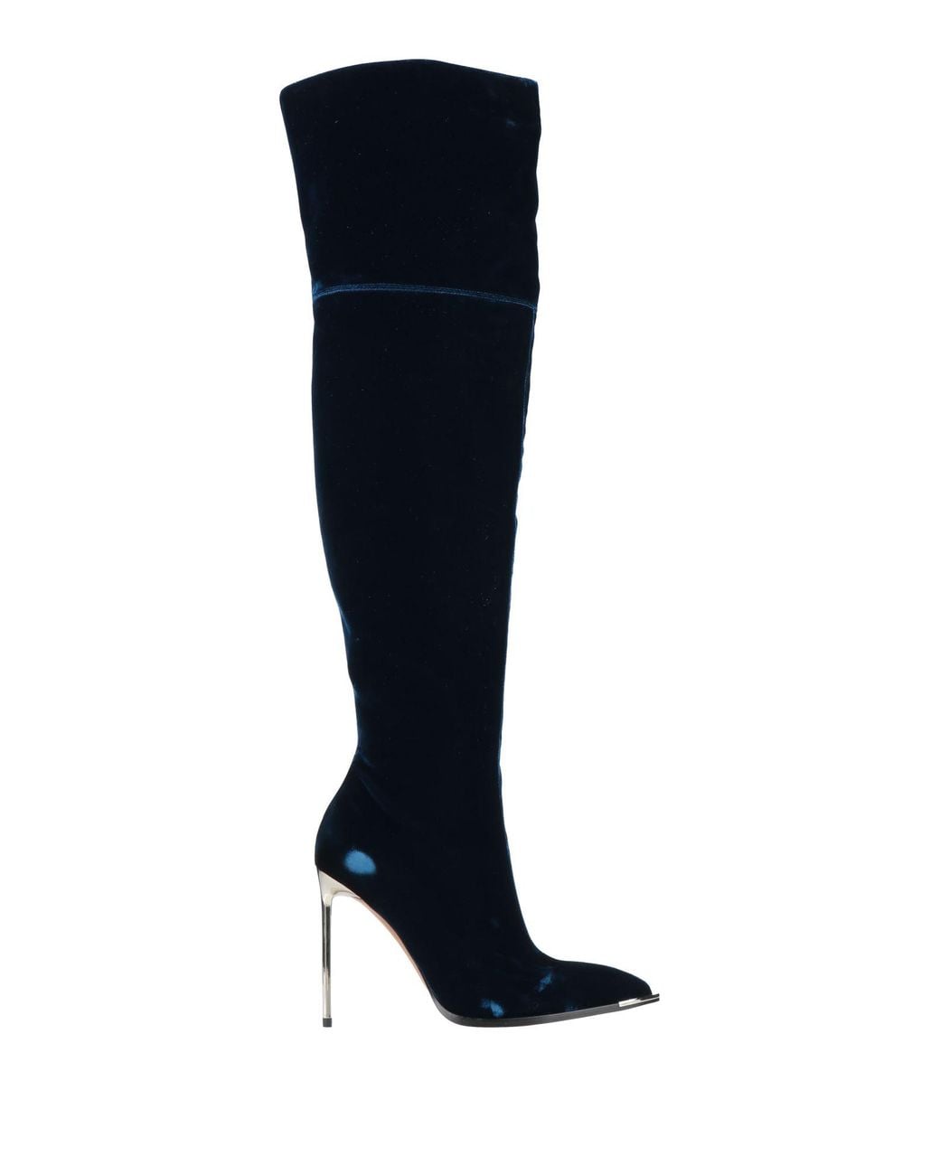 Over-the-knee boots, velvet, solid color, no appliqués, leather lining, zipper fastening, pointed toe, stiletto heel, leather sole, contains non-textile parts of animal origin, amp up the glamour with chic designer party outfits for your next event or fun night out , Color: Blue , Size: 4.5
