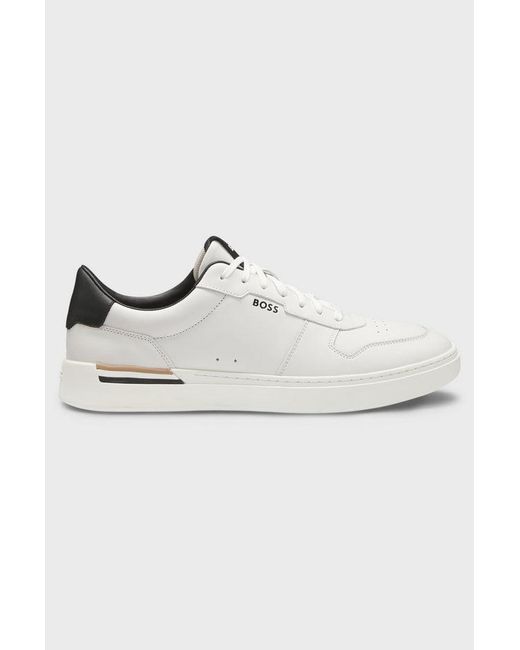 Con tomaia in pelle liscia e design a taglio basso, queste sneakers BOSS Uomo si distinguono per i dettagli ricercati e l'esclusivo motivo a righe sulla suola laterale. La suola flessibile assicura comfort durante tutta la giornata. Il modello e dotato di lacci ed e completamente foderato. Questo prodotto contiene almeno l'80% di materie prime di qualita superiore e la pelle utilizzata proviene da concerie certificate. Materiale di superficie 100% pelle di mucca, fodera in poliestere e pelle di mucca, dettagli interni in poliestere e poliuretano, suola in gomma e suola interna in poliestere. Codice prodotto Clint_Tenn_ltvpN 10249945 01140 A25 Color: white