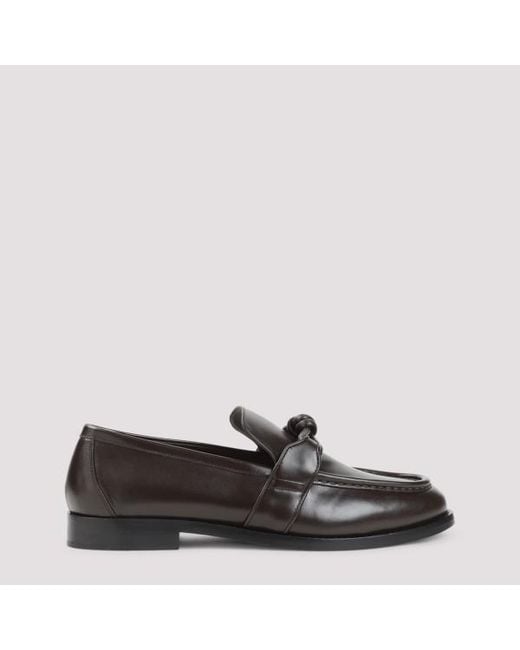 Bottega Veneta Fondant Leather Astaire Loafers. Pure brown leather loafers, round toe, top tonal leather strap with knot detail, slip-on style, tonal sole, tonal stitching. Color: black
