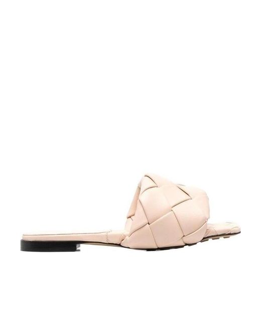 Pink flat sandals, open toe, logo leather insole, rubber flat sole. Intreccio woven leather flat sandals Color: bandage beige Glue-injected leather outsole
