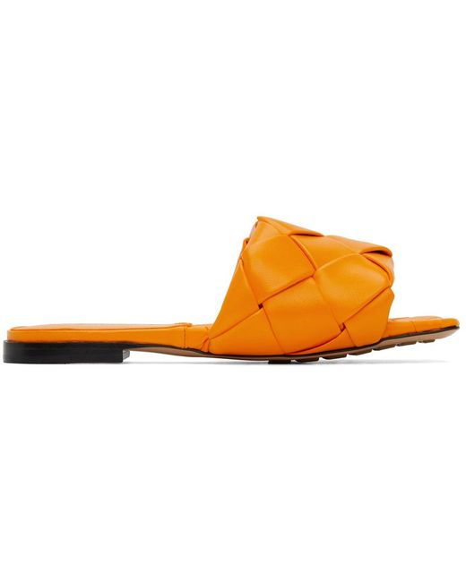 Intreccio-woven lambskin slip-on sandals in orange. · Open square toe · Logo embossed at padded leather footbed · Leather outsole in tan with rubber injections Supplier color: Tangerine