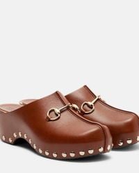 Pitea clogs in "Cognac" suede calfskin. They feature a round toe, smooth brown leather Triomphe insert on the upper, golden metal details on the sides, an anatomically designed inner insole with logo, and