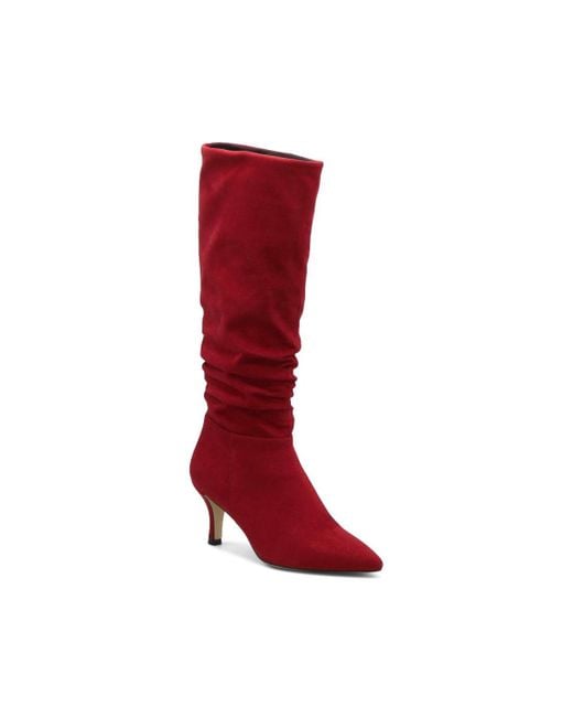 A stunning knee high boot is framed by a pointy toe with just the right heel height and slouchy shaft. Microsuede Fabric/Balance Manmade. Color: red