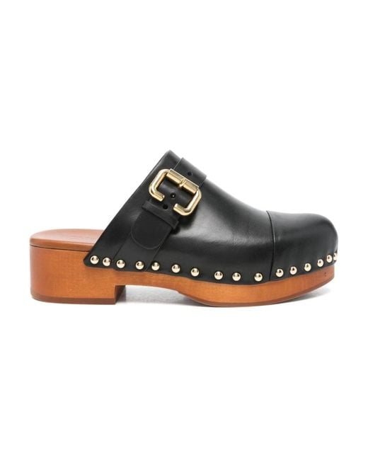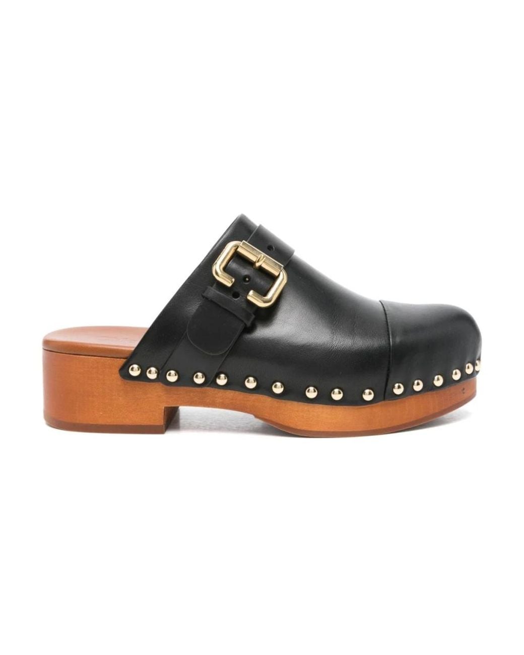 Elevate your style with these Chloé black slip-on heeled mules featuring a mid block heel, decorative buckle detail, and a comfortable 6 cm heel height. Perfect for the modern woman.