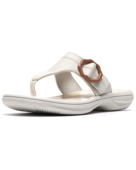 Prepped for a season of warm-weather exploring, flip-flop Clarks Cloudsteppers Breeze Cove channels signature Cloudsteppers comfort with its Cushion Soft foam footbed Durable synthetic upper Cushion Soft foam footbed delivers shock absorption and comfort Adjustable riptape strap with decorative buckle delivers a secure, custom fit Grippy and flexible TPR (thermoplastic rubber) sole brings extra stability and traction. Color: black