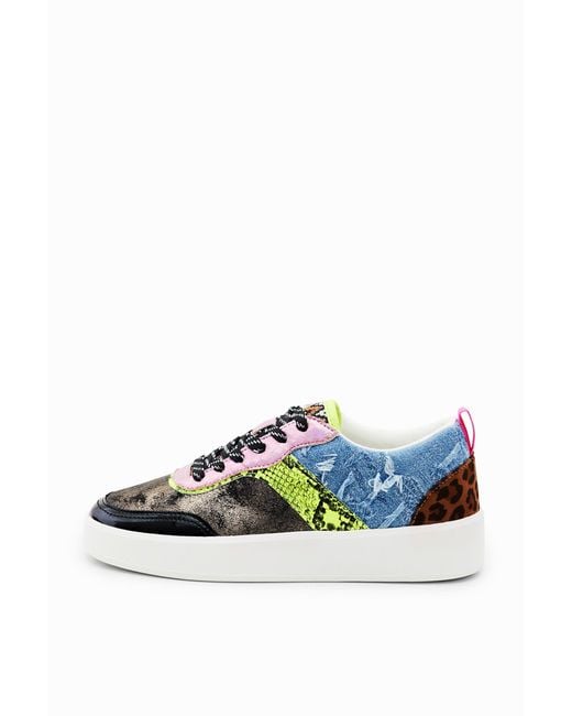 Sneakers with a patchwork of animal print, denim and very different fabrics that fuse into a very urban look. Lace fastening. Patchwork of different fabrics and textures. Two-tone laces. Color: blue