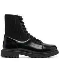 Go to SSENSEAnkle-high buffed calfskin boots in black. Distressing and logo hardware at round toe. Tonal nine-eye lace-up closure. Rubberized logo patch and raw edge at padded tongue. Tonal buffed leather pull-loop and logo hardware
