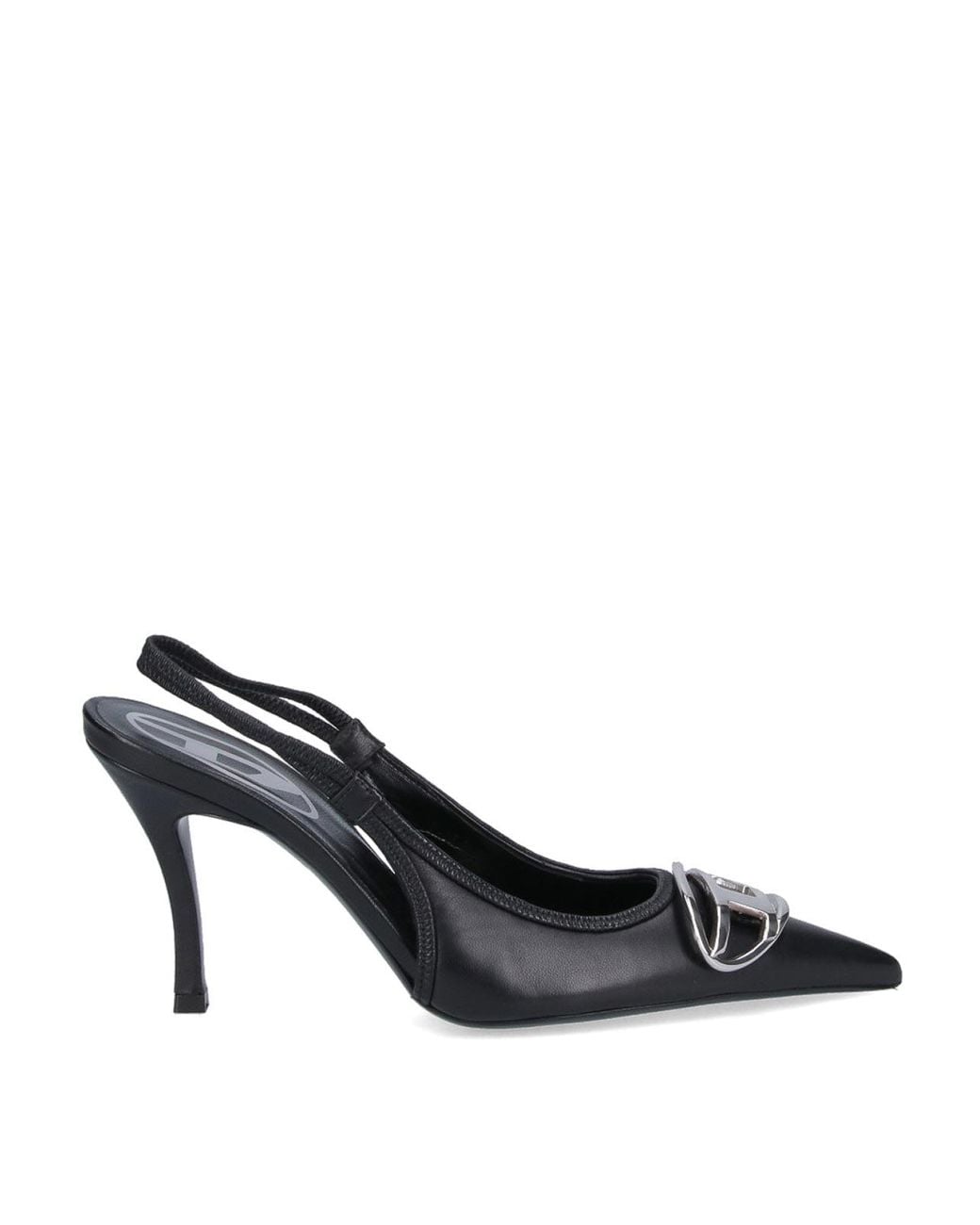 Diesel d-venus slingback in black leather pointed toe upper silver metallic logo elastic back stiletto straps Color: black