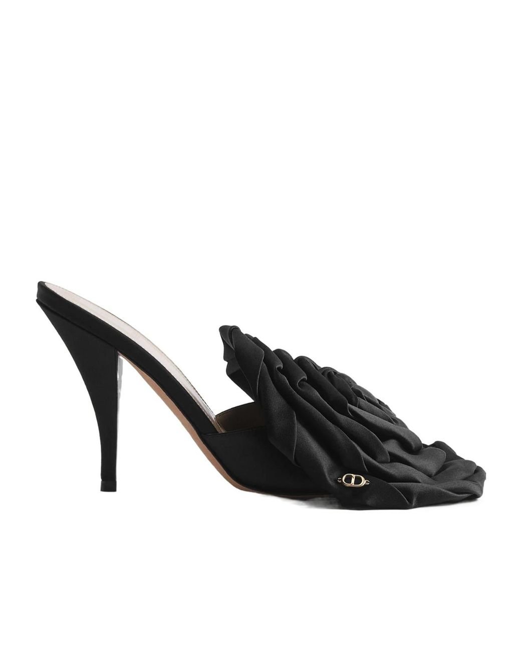 The shoe is adorned with a large black satin flower, features an open heel, and a gold metallic CD signature. Color: black