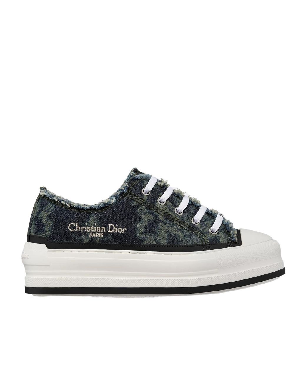 The Walk'n'Dior platform sneaker expands the line with a modern creation. The fringed cotton upper is embroidered with a khaki Dior Ornemental motif, showcasing a graphic twist on a baroque pattern, and further enhanced by the Christian Dior Paris signature in gold-tone metallic thread on the side. The style is completed by the Christian Dior Paris signature on a comfortable, thick and ultralightweight sole and embroidered cotton tongue. The sneaker will lend a contemporary touch to relaxed looks. Color: black
