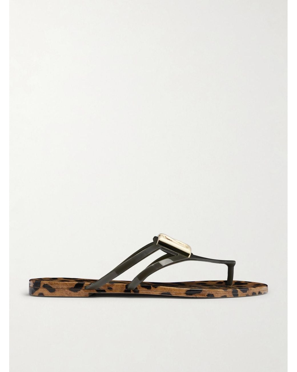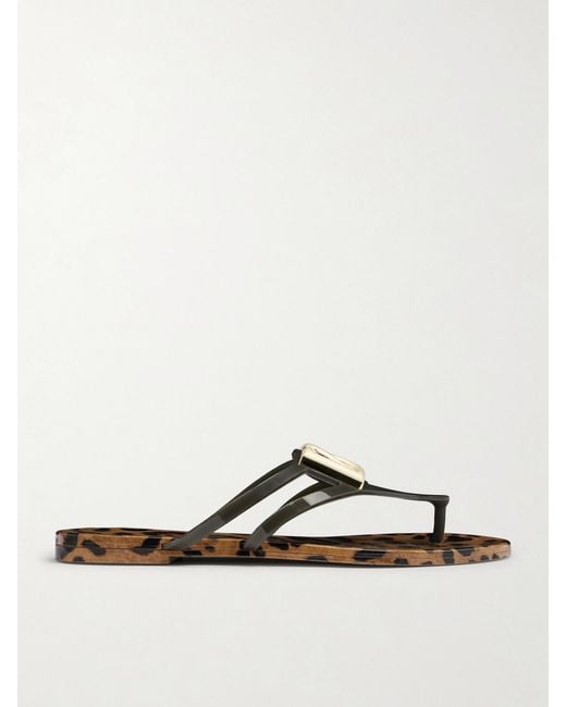 Bold animal print defines these flip flops by Dolce&Gabbana. Crafted in Italy from flexible rubber, they feature slender straps centered by the house’s gold-tone DG logo hardware. Set on a leopard-print footbed, two slim straps provide added support while maintaining a light feel. Color: multicolor